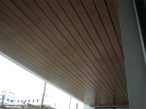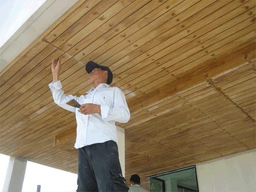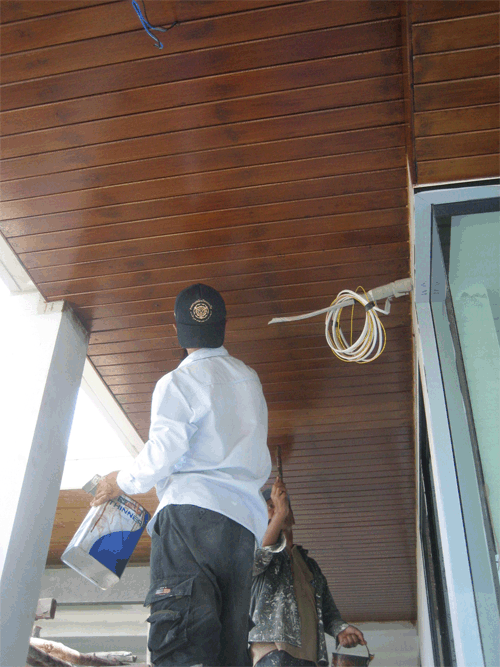 ผมทาสีย้อมไม้ เฉพาะที่ตัวฝ้าเท่านั้นนะครับ สังเกตว่าตัวเชิงชาย จะเป็นสี