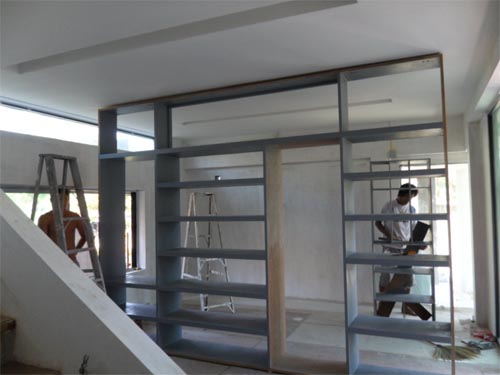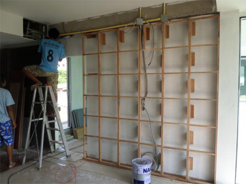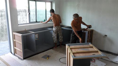 เอาแผ่นไม้บางๆปูพื้นแล้วตู้ต่างๆก็ถูกประกอบ และยึดไว้กับตำแหน่งที่แพลน