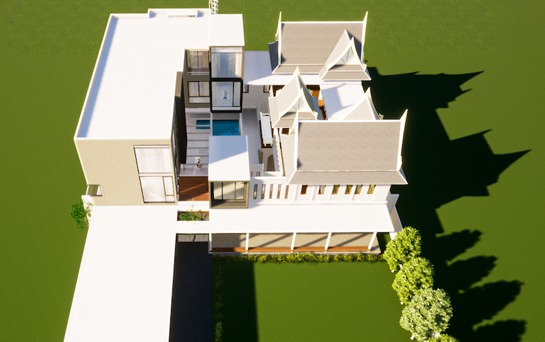 บ้านพักอาศัย 3 ชั้น สร้างที่ถนนอนามัยงามเจริญ แขวงบางมด เขตจอมทอง ขนาด 1,858.33 ตร.ม. ประกอบไปด้วย 6 ห้องนอน 10 ห้องน้ำ 2 ห้องแม่บ้าน 1 ที่จอดรถ