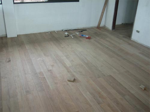 ปูพื้นเสร็จใหม่ๆ พื้นมันจะยังไม่เรียบเสมอกันหรอกนะครับ ต้องขัดผิวหน้าไม้