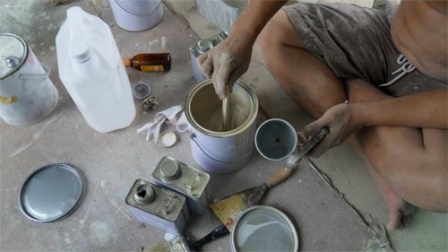ช่างกำลังผสมสีอยู่ ที่เห็นในมือซ้าย