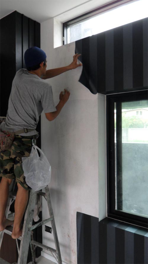 ช่างกำลังแปะวอลเปเปอร์อย่างขมักเขม้น