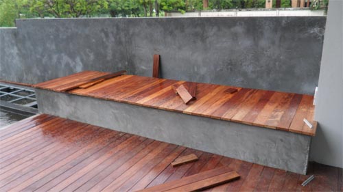 ฝาปิดบ่อกรอง ผมทำเป็นแท่นนั่ง เปิดปิดแผ่นไม้ได้ อันนี้ก็ปูชิดและทาสีย้อม