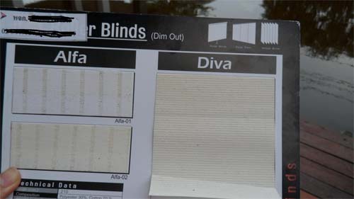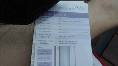 ตัวอย่างเนื้อม่านจะอยู่ด้านหลังแผ่นสเปก ดูดีๆ จะมีบอกชนิดวัสดุ ราคา