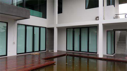 ของประตูอลูมิเนียมเป็นตัวบังช่องห่าง เมื่อมองจากภายนอก จึงดูเหมือน